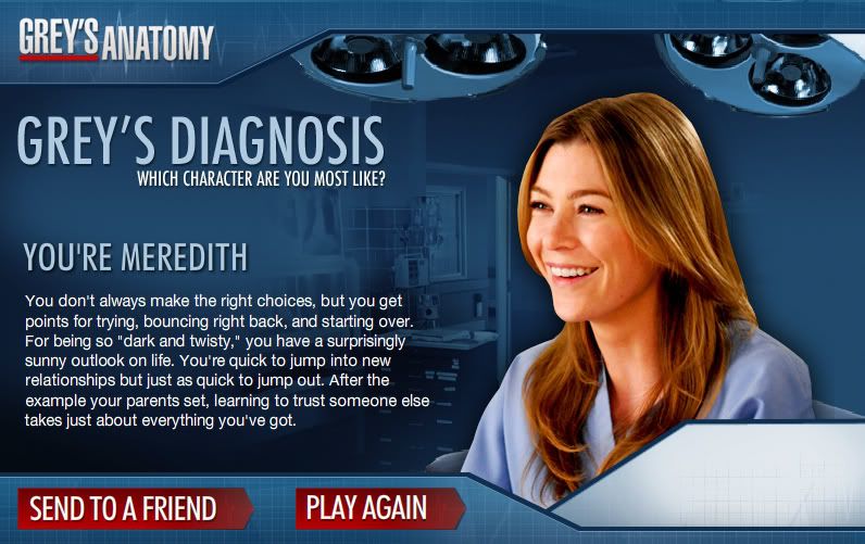 4/20/2007 01:37:00 PM I took the Grey's Anatomy quiz online today after watching last night's episode (which btw, while watching it, I noted to Sam, how fucked up Meredith is) only to find out that I AM Meredith. Which in description, I can hardly argue with. ![]() "You don't always make the right choices, but you get points for trying, bouncing right back, and starting over. For being so "dark and twisty" you have a surprisingly sunny outlook on life. You're quick to jump into new relationships but just as quick to jump out. After the example your parents set, learning to trust someone else takes just about everything you've got." This sucks ass. But seems quite true. Even Sam agrees, and well..she lives with me so, she probably knows better than I. We were even just having a conversation about this the other day, and my trust issues, and crappy past with my parents, yet I'm always all 'look at it this way' and taking shit and trying to make it into sunshine. Anyways, I also wanted to post this the other day. My new love. Amy Winehouse.